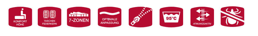 ❙ Hochwertiger 7-Zonen-Taschenfederkern mit 480 Federn ❙ Beidseitig Thermofilz-Abdeckung mit je 5 cm Komfortschaumauflage im Raumgewicht 35 kg/m³ bzw. 40 kg/m³ ❙ Komforthöhe ❙ Rundumlaufende extra stabile Schaumstoffstege (im Raumgewicht 35 kg/m³, 6 cm breit) garantieren die notwendige Stabilität im Randzonenbereich ❙ Auch in Wendeausführung erhältlich ❙ Trikot-Unterbezug