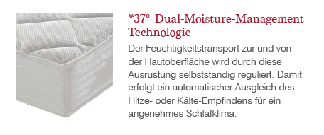 *37° Dual-Moisture-Management Technologie Der Feuchtigkeitstransport zur und von der Hautoberfläche wird durch diese Ausrüstung selbstständig reguliert. Damit erfolgt ein automatischer Ausgleich des Hitze- oder Kälte-Empfindens für ein angenehmes Schlafklima.