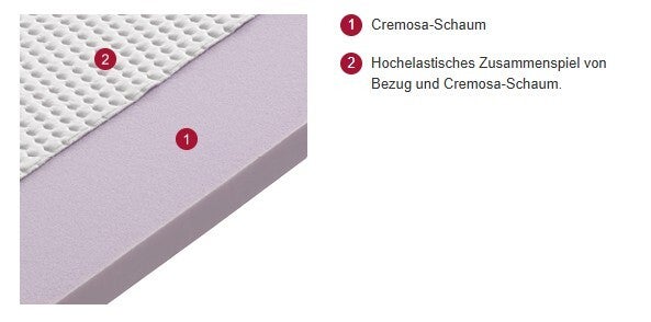 - Der Cremosa-Schaum gleicht durch das soft-elastische Rückstellverhalten jede Veränderung der Schlafposition sofort aus und fördert so einen ausgeglichenen Schlafablauf.