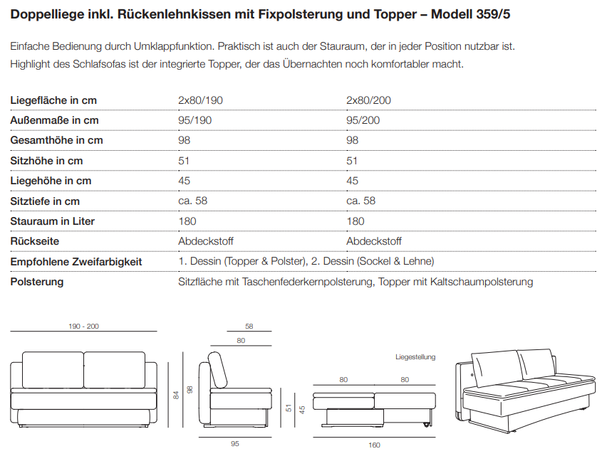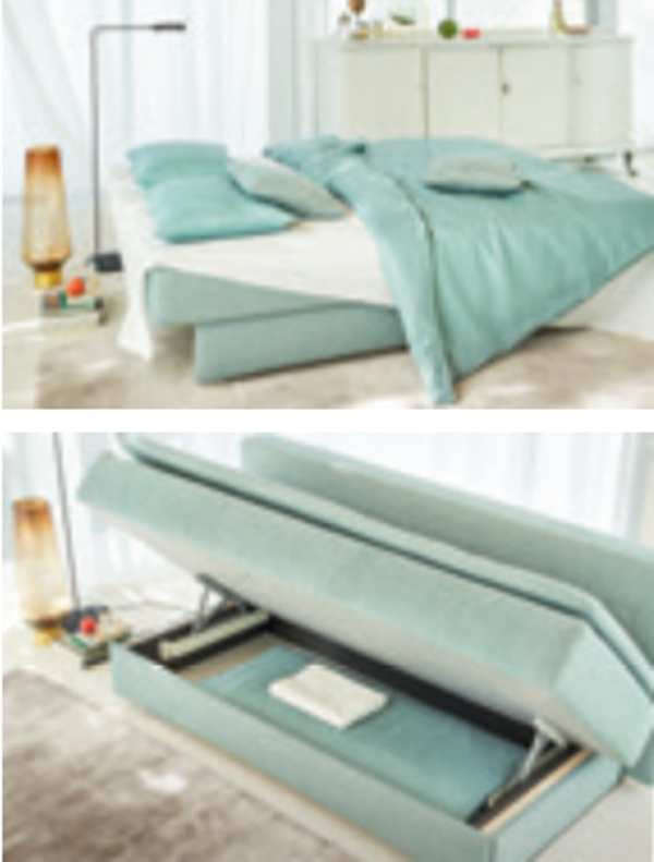 Durch die Umklappfunktion ist Perla kinderleicht in ein Doppelbett zu verwandeln. Praktisch ist auch der Stauraum, der in jeder Position nutzbar ist. Eine Besonderheit des Schlafsofas ist der integrierte Topper, der das Übernachten noch einfacher und bequemer macht.