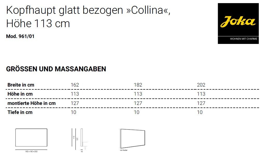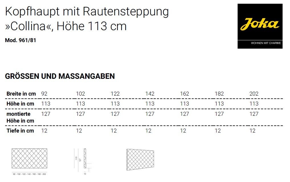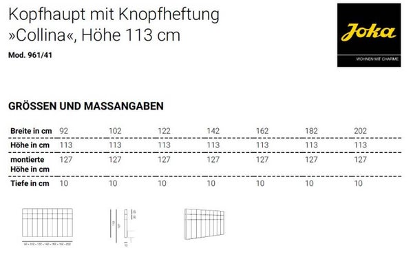 Egal ob Sie sich für das Kopfhaupt mit Knopfheftung, Rauten- sowie Rechtecksteppung oder glatt bezogen entscheiden – Collina ist einfach, elegant und reizvoll. Das Kopfhaupt gibt es in der Höhe 113 cm und ist in verschiedenen Breiten erhältlich.